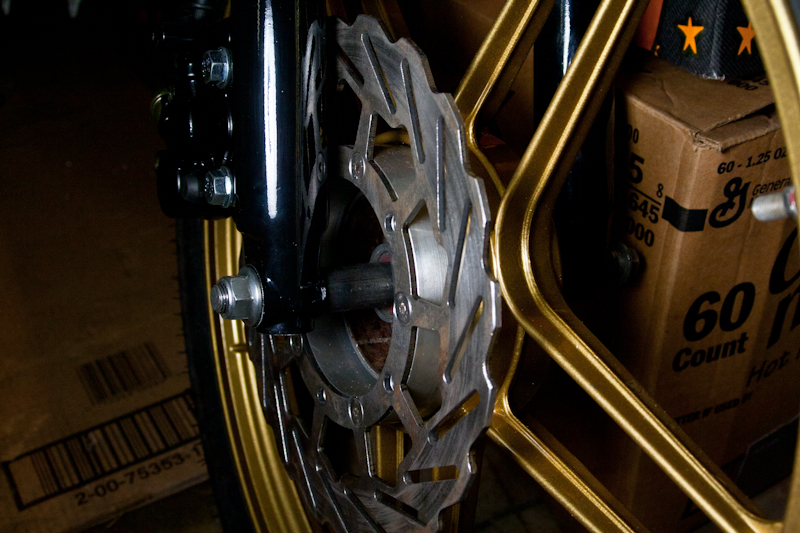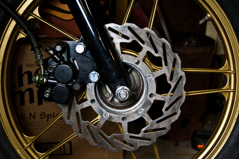 Mounted the SSR forks and the Mike T disc brake. The disc brake could not be mounted with the original hardware because the nuts hit the caliper mount on the forks. I had to re-drill and tap the disc brake ring adapter for some counter sunk allen bolts. After that it was almost all good. Then i noticed the brake rotor hit a caliper bolt, so I needed to stick the whole disk in a lathe and turn town the outer edge be about 4mm to clear the disc. After all fo that it works great!