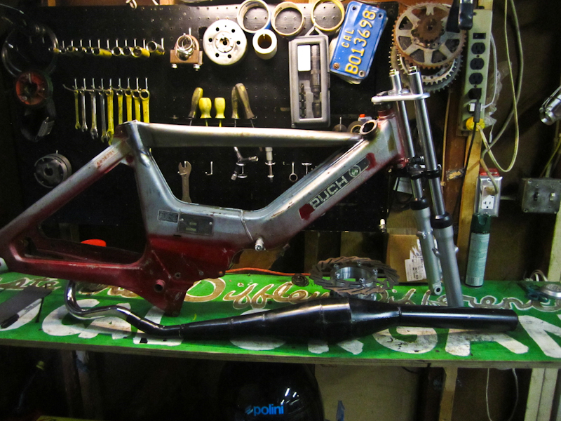 It started with my first moped, a Maxi N frame. I got into mopeds because a good friend was always riding them and telling me how fun they were. I grew up on a farm with a dirt bike and a banshee so I wasn’t sold on the idea of a slow moped until I rode his Garelli Top tank. After looking at all the different mopeds I decided I wanted a Puch Cobra. Good choice for a first moped! I could not find one and decided I would have to look for something else. At some point I found Paz’s orange Maxi N and loved the lines. I decided to try to track down a Maxi N. I was able to find a Frame with a leaky tank on MA in late 2008. The tank was rusty, it had pin holes, and swing arm looked like it got t-boned. It was my first moped part and I didn’t know what to do with it. I decided I wanted to top tube it and powder coat it white. I was wishing the powder coating might fill the pin holes. After welding the top tube in and getting the frame powder coated I realized the pin holes were still there and now I just had a pretty frame to hang on my wall. I talked to some old timers from where I grew up in the country and they suggested red-kote to line the tank and fill the holes. My neighbor who runs a machine shop had a can of it and let me use it, it worked great. Now I was back on track to build this moped.