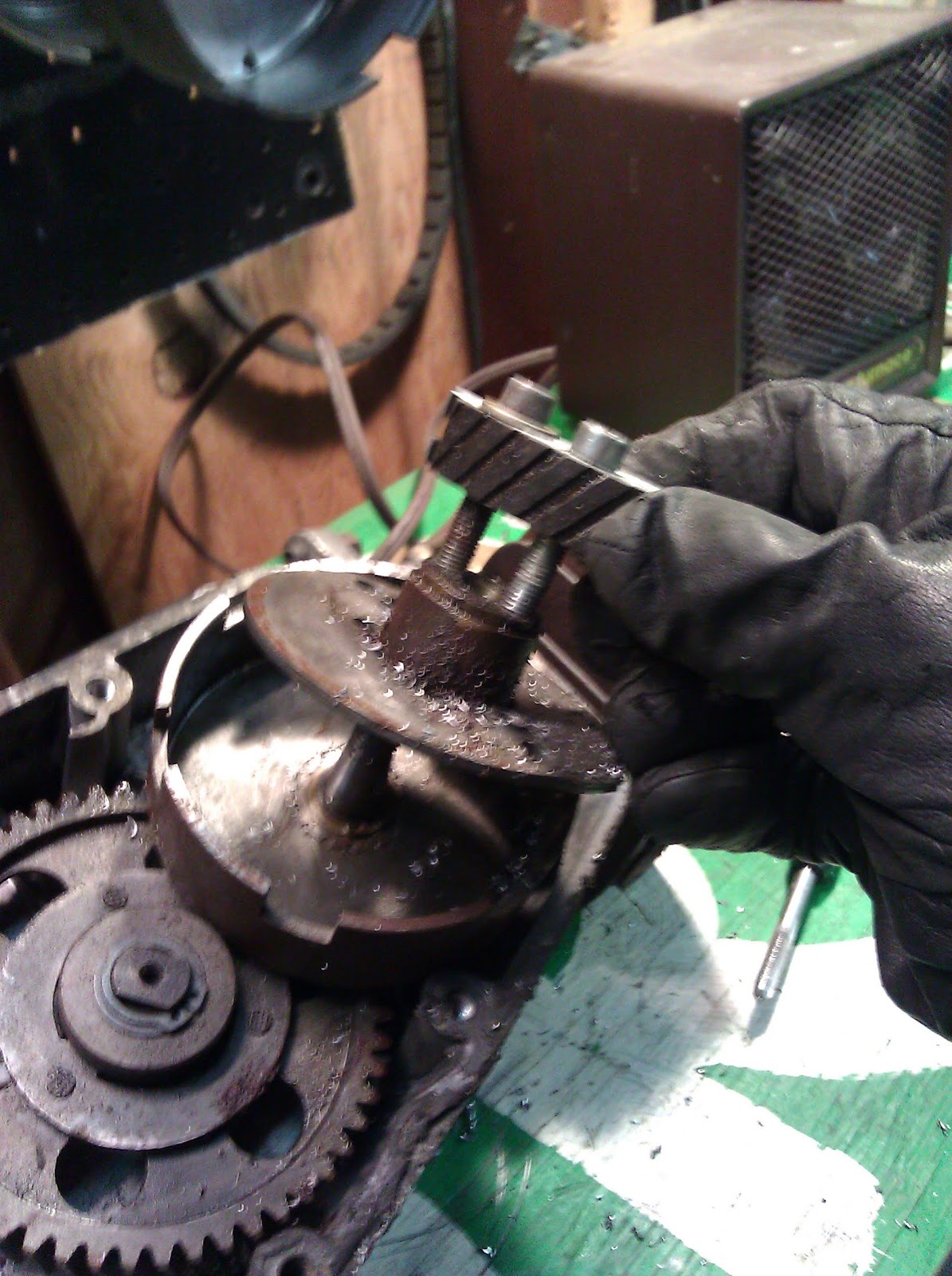 I needed to get the clutch out. 🙁 Bummer town. That thing was hella stuck. So i took one of the clutch shoes and drilled some holes in it, drilled and tapped some holes into the clutch plate, and then pulled it like a puch. Cause thats what I know SUCKA!
